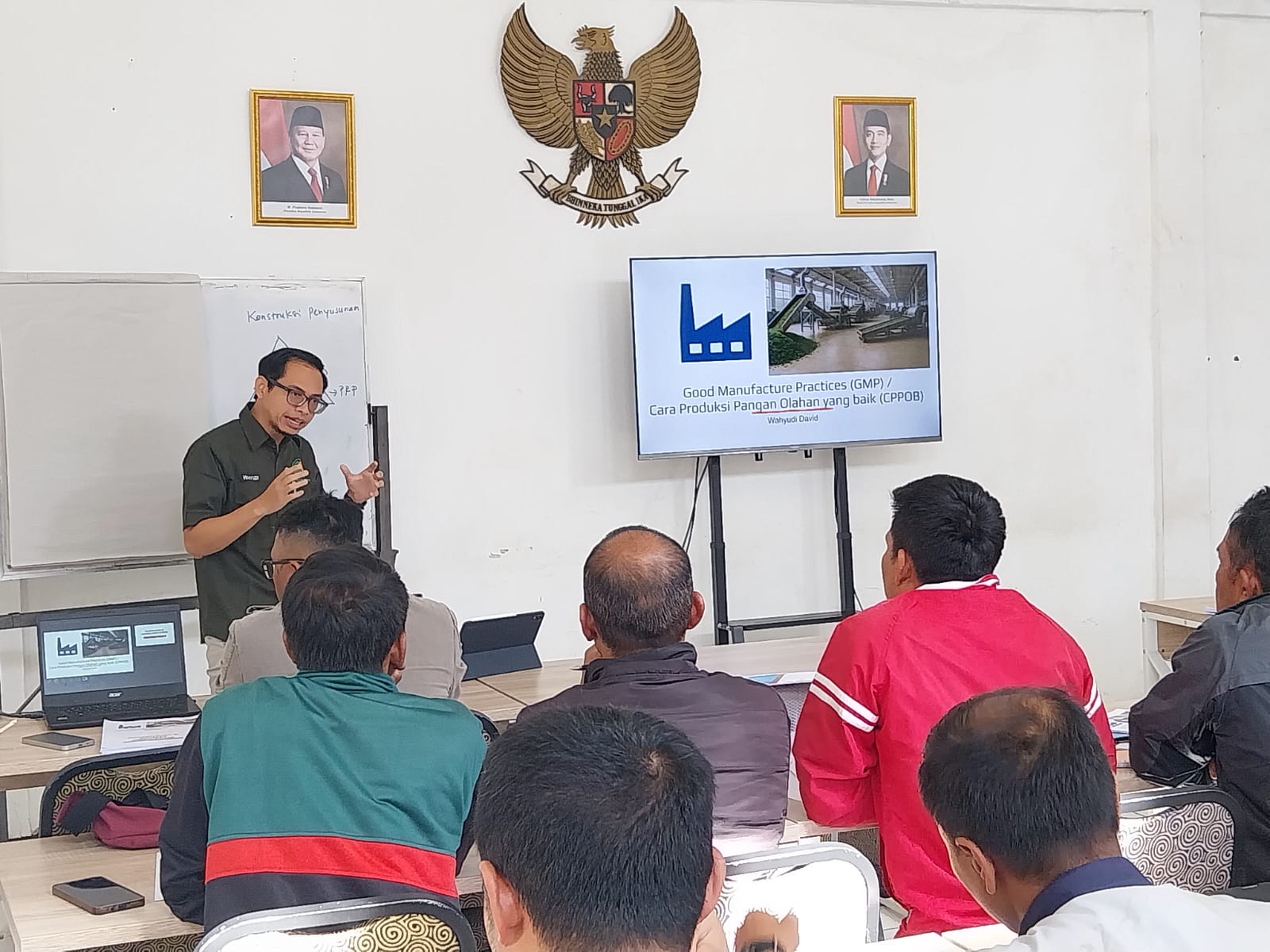 Pelatihan hari pertama difokuskan pada pemahaman menyeluruh tentang GMP dan SSOP, mencakup desain dan infrastruktur fasilitas produksi, pengelolaan utilitas dan limbah, manajemen bahan baku, hingga higiene pekerja dan pengendalian hama. Materi disampaikan secara mendalam oleh para trainer berpengalaman, antara lain Dr. Wahyudi David dan Gandi Bayu, dengan pendekatan praktik dan evaluasi melalui pre-test dan post-test agar peserta dapat mengukur peningkatan kompetensinya.